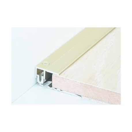 Profilé breveté en aluminium plaqué stratifié réglable de 7 à 12mm. Pas de différence d'aspect avec le sol. Excellente résistance à l'abrasion et aux rayures. Chapeau standard à clipser sur la base. Existe en dénivelé et en symétrique.