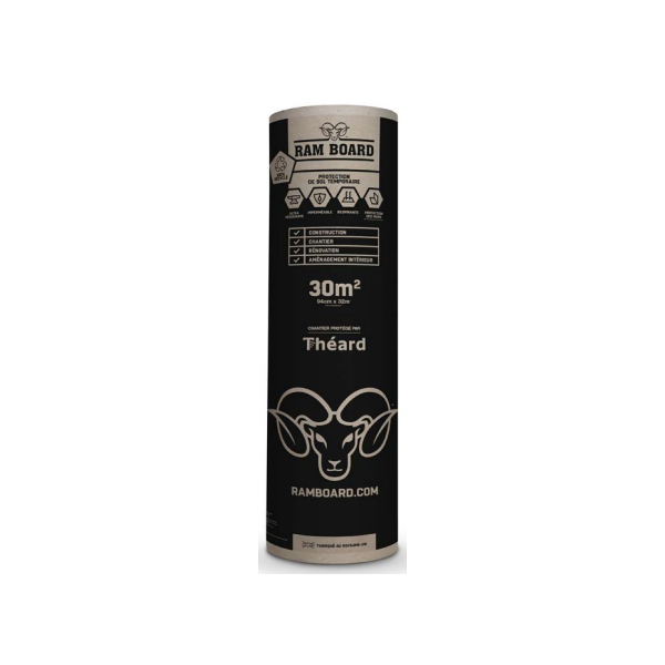 Protection de surface RAM BOARD 30m². La protection de sol RAM BOARD est un mélange de fibres 100% recyclées. Imperméable grâce à la technologie Spill CuardTM, elle protègera tous types de sols : parquets, bétons colorés, pierres, marbres terrasses, carrelages, linoleums, revêtements époxy, bétons fraîchement coulés, sols récemment posés. Réutilisable : stabilité de la protection et facilité d'enroulement. Coupe simple et rapide. 100% recyclé et 100% recyclable. Protection 2 en 1 sols et murs.