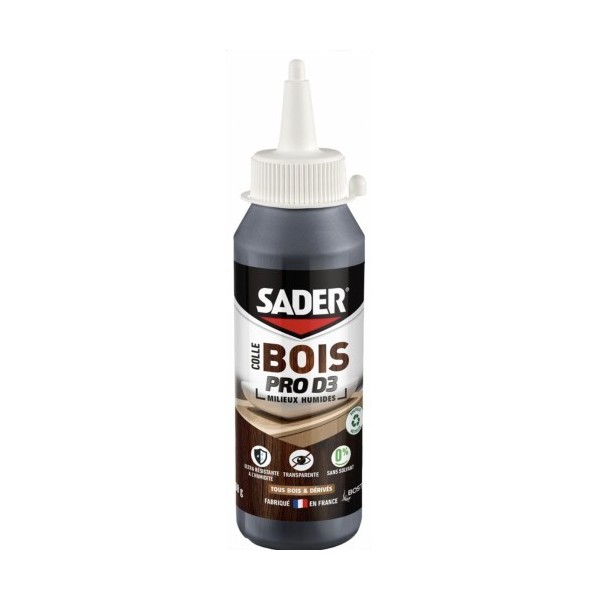 | Conseils | Sader colle bois Pro D3 est prête à l'emploi. Les surfaces à coller doivent être propres, planes, sèches et dépoussiérées. Appliquer une fine couche de colle sur l'une des parties à assembler. Pour une surface importante, un encollage à double face est recommandé. Assembler les parties dans les 5 min qui suivent l'encollage. Serrer l ensemble à l'aide d'un serre-joint ou tout autre moyen pendant 30 minutes. |