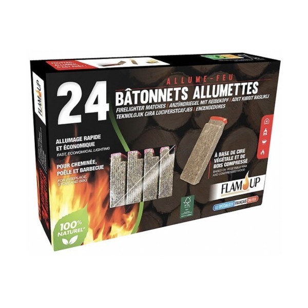 Allume-feux Flam'Up en bois compressé de 24 bâtonnets-allumettes composé de 49% de bois compressé,50% de cire naturelle et de 1% de bouton rouge. Deux plaques prédécoupées de 12 bâtonnets-allumettes. Chaque plaque est filmée individuellement. Allumage rapide, économique et sans odeur, pour cheminée et barbecue. Conforme à la norme pour allume-feux EN 1860 : 3