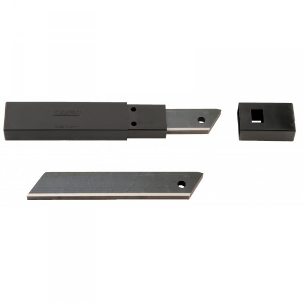 Lame Olfa noires Cutter 18mm Conditionnement Étui 10 lames Lames sécables Épaisseur 0. 50mm. Acier inoxydable avec revêtement noir anti-corrosion. Distributeur de sécurité en plastique