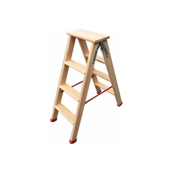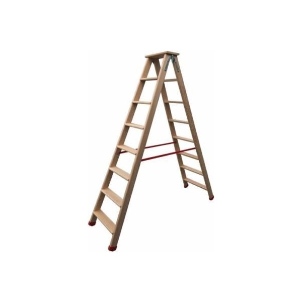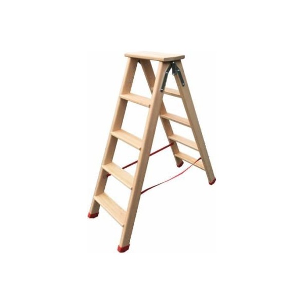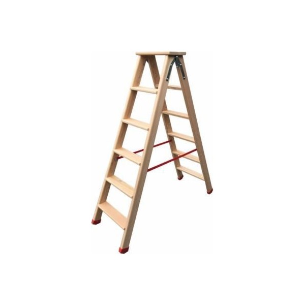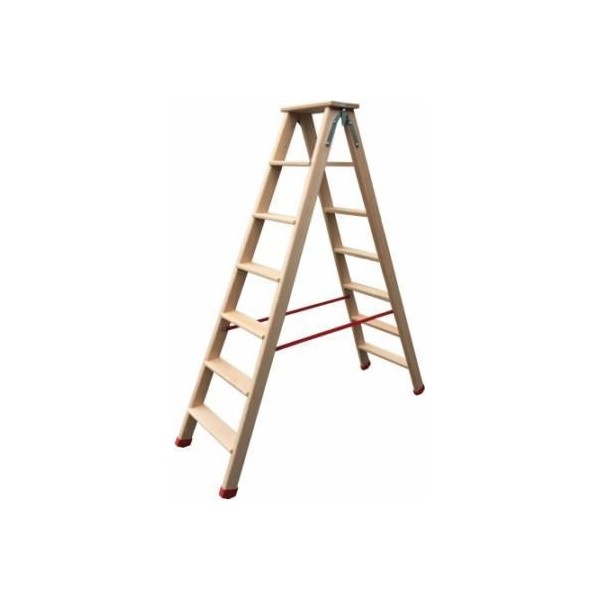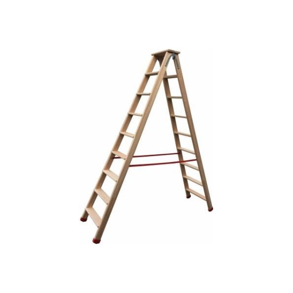 Echelle double à marches en bois, avec tablette, marches haubannées et anti-dérapantes. Butée d'écartement par compas. Sangle de sécurité nylon. Crochet porte camion. Traitement fongicide. Existe en différentes hauteurs.