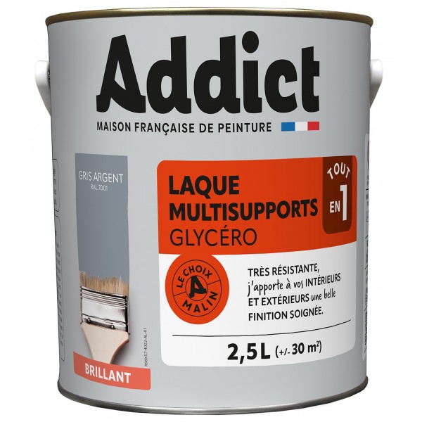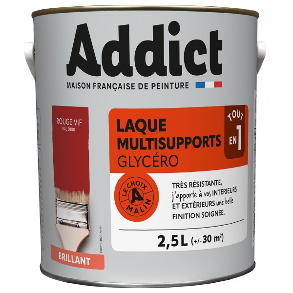 | Conseils | Se conformer au DTU 59. 1. Préparation - Les supports seront propres et sains, les anciennes peintures convenablement lessivées, et les parties métalliques protégées par une couche de primaire anti-rouille. APPLICATION - Bien mélanger avant application. Sur fonds cohérents préalablement imprimés, appliquer 2 couches de ADDICT Laque Glycéro Brillante sans dilution. Ne pas appliquer par température inférieure à 5°C ou supérieure à 30°C. |