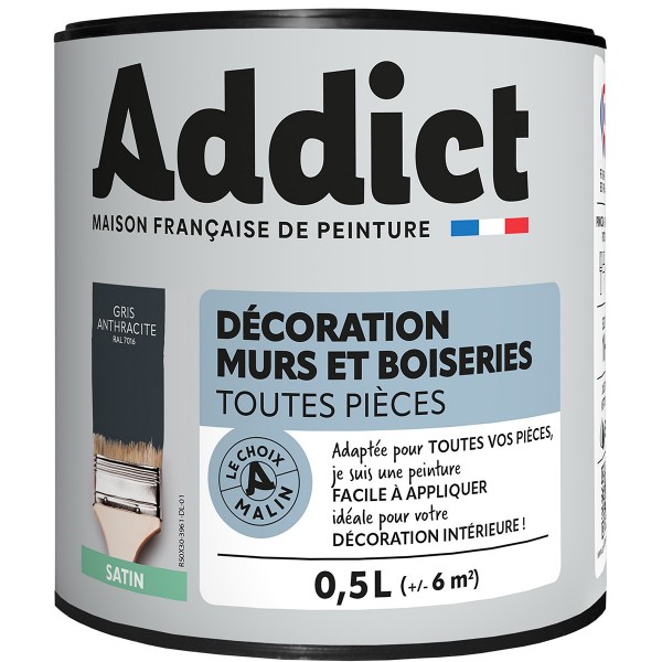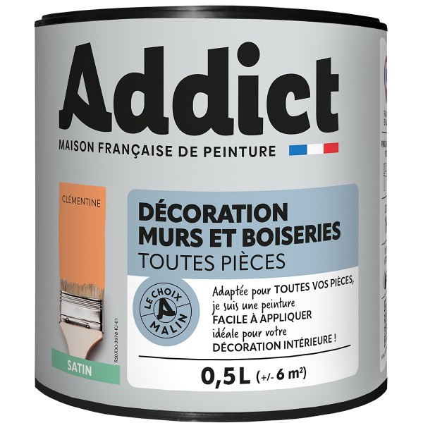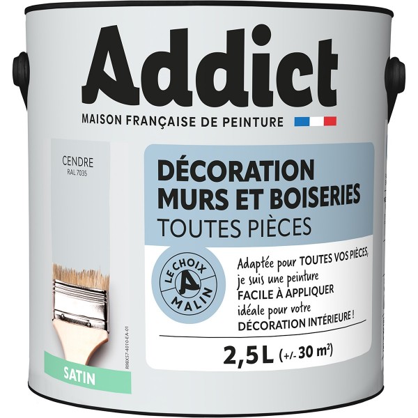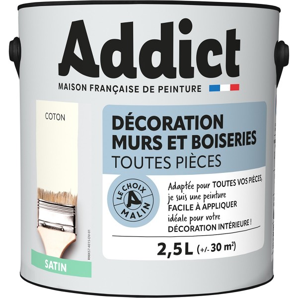 | Conseils | Se conformer au DTU 59. 1. Préparation - Les supports seront propres et sains, les anciennes peintures convenablement lessivées, et les parties métalliques protégées par une couche de primaire anti-rouille. APPLICATION - Bien mélanger avant application. Sur fonds cohérents appliquer 2 couches de ADDICT Peinture Acrylique Satinée. Ne pas appliquer par température inférieure à 5°C ou supérieure à 30°C. |