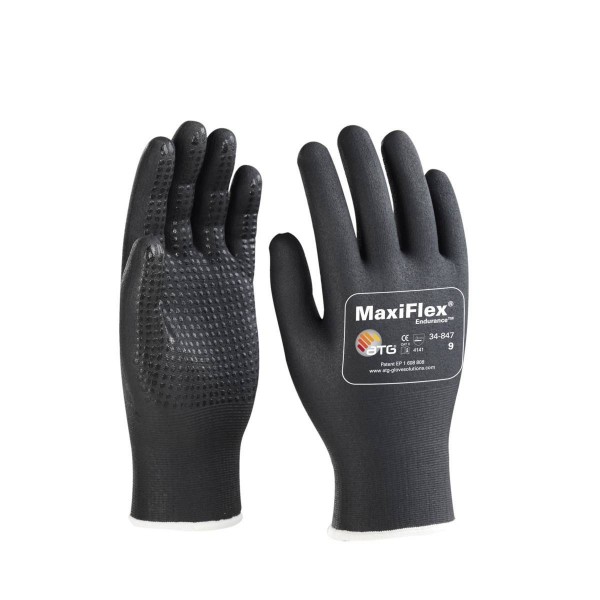 Gant usage manutention lourde. Lavable à 60°. Support tricoté sans couture Nylon/Elasthane. Très résistant à l'abrasion et à la déchirure. Très agrippant. Laisse le sens tactile intact. Respirabilité à 360°. Couleur : noir. Norme NF EN 388 : 4131A