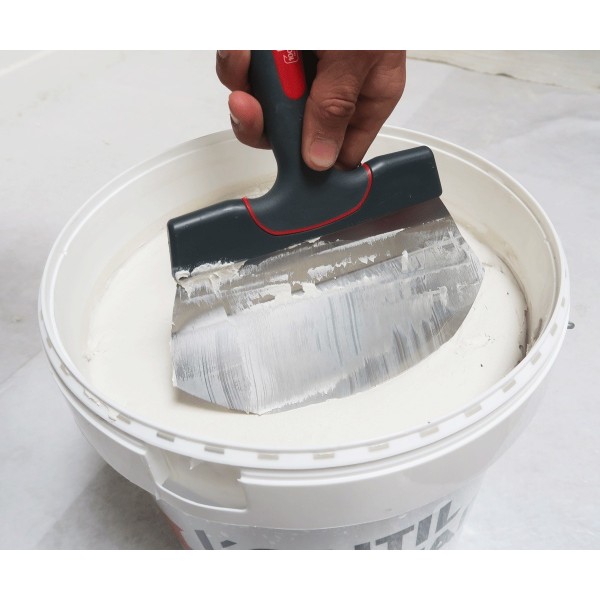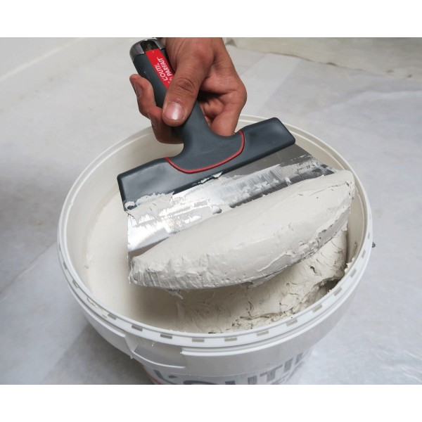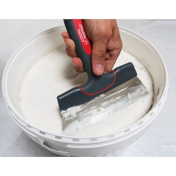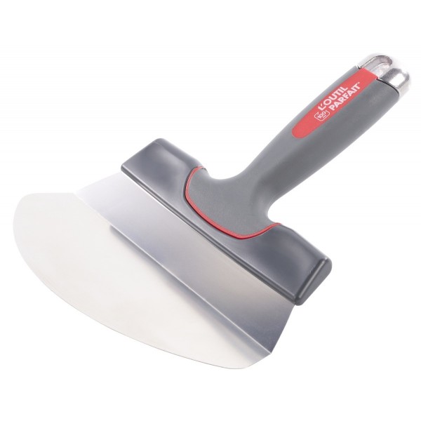Couteau stucateur Alu. Choc® pour seau 17 kg Taille 19cm Lame acier inoxydable 0. 5mm. Surmoulée. Lame souple et flexible. Courbée. Manche ergonomique bi-matière, étanche et indémanchable. Embout aluminium traversant