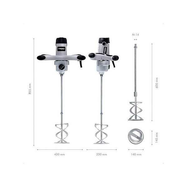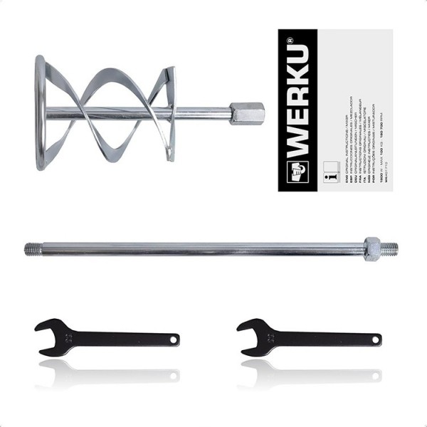 Werku WK401710-Mélangeur Peinture-Mortier. Qualité Professionnelle comprend 1 tige mélangeur. Puissance de 1800W, tours de 180-400 et 300-700 par minute,12 vitesses, couple maximal de 70Nm et capacité de mélange de 100kg. Corps en ABS composite et aluminium anodisé, manche ergonomique et antidérapant, sélecteur de vitesse et sélecteur de 2 gammes de vitesses. Comprend tige mélangeuse de 140 mm et manuel d'instructions. Excellente norme de qualité, durabilité, résistance.