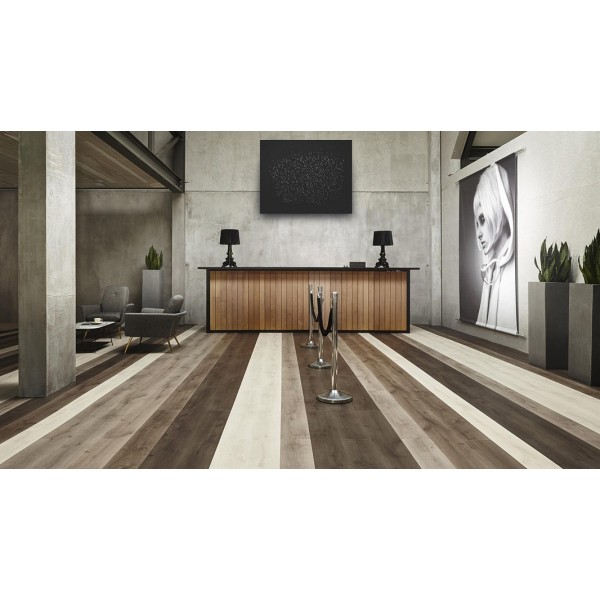 Revêtement de sol PVC hétérogène compact, classé A+ COV, d'une épaisseur de 4,5mm à cliquer, d'une couche d'usure de 0,55mm qui lui permet d'être classé en usage 23/33/42. Bénéficie d'un traitement surface TopClean XP évitant toute métallisation et facilitant son entretien. Paquets de 1,61m² (lames de 121,1x19,05cm) et de 1,79m² (lames de 149,1x24,05cm).