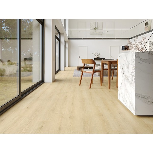 Revêtement de sol Vinyle Composite Rigide (VCR), avec sous-couche intégrée, à cliquer d'une épaisseur de 5mm (4 + 1). FLORAFLOOR Tango VCR Clic 55 est classé 23/33 (usage résidentiel élevé ou commercial élevé), et Feu Bfl-S1 (NF EN 13501-1). Il bénéficie d'un traitement de surface PUR, d'une couche d'usure de 0,55mm, et offre une excellente stabilité dimensionnelle de < ou = à 0,04%, et une résistance au poinçonnement < ou = à 0,02mm. Il est résistant à l'abrasion (groupe T). Il est anti-dérapant DS (R10), apporte une correction acoustique de 19dB, a une solidité à la lumière > ou = à 6, et il est très résistant aux sièges à roulettes et aux pieds de meubles. Il convient au chauffage par le sol (maxi 27°C) et bénéficie d'une garantie de 15 ans en usage résidentiel.