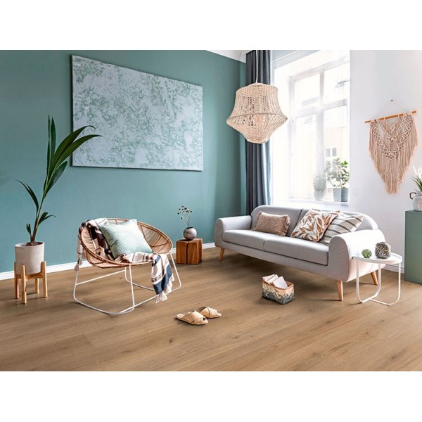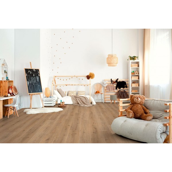 Revêtement de sol stratifié classé AC4, finition de surface effet structure bois. Equipé du clic 5G dernière génération permettant de poser individuellement chaque lame facilement. Chanfreiné sur les 4 côtés pour un effet décoratif plus marqué. Il est garanti 25 ans contre l'abrasion pour un usage privé, et 3 ans pour un usage commercial. Paquet de 2,130m² : 8 lames de 1380x193mm.