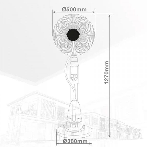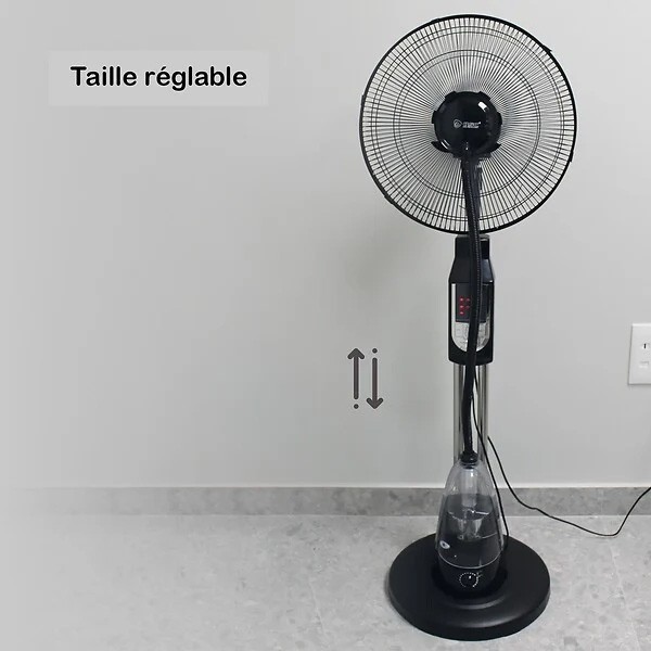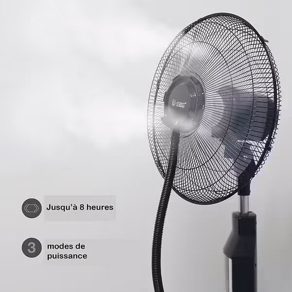 Découvrez le ventilateur brumisateur avec pied + télécommande GSC 40cm 70W, un ventilateur puissant et polyvalent avec fonction de vaporisation pour rafraîchir votre espace pendant les jours chauds. Avec ses 2 positions, fixe ou tournante, et son réglage d'inclinaison, vous pouvez personnaliser le flux d'air selon vos préférences. La minuterie réglable de 30 minutes à 7,5 heures vous permet de programmer la durée de fonctionnement du vaporisateur. Grâce à sa capacité d'eau de 1,5 litres, vous pouvez profiter d'un brouillard rafraîchissant pendant environ 8 heures. Couleur : noir. Hauteur : 40cm. Puissance Max : 70W.