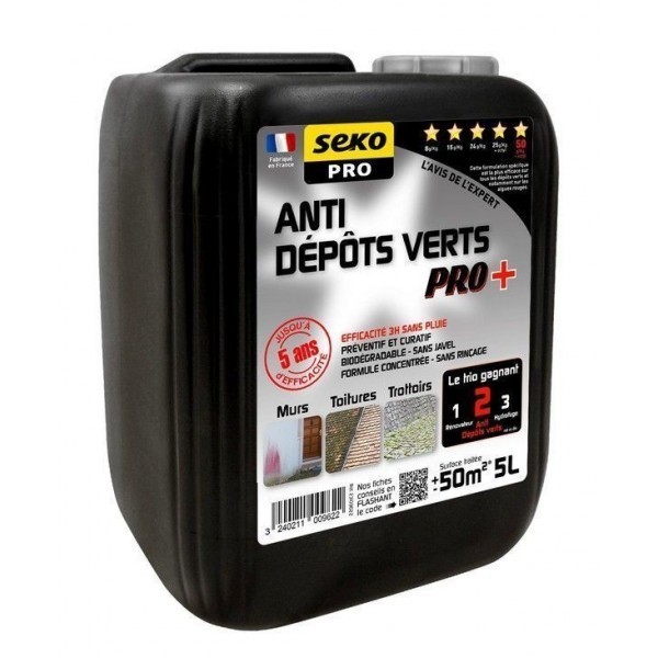 Détruit tous les dépôts verts, lichens, bactéries, champignons et algues rouges. Curatif et préventif. 100% actif après 3 heures sans pluie. Produit concentré, possibilité de le diluer jusqu'à 50%. Traite jusqu'à 50m². Concentration : 50g/kg de chlorure n. n-. Dimethylakybenzylamonium+ 5,8g/kg d'octyl-isothiazolone.