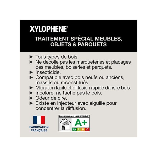 Produit insecticide, fongicide et anti-termites destiné au traitement préventif et curatif des bois intérieurs et extérieurs contre les insectes à larves xylophages, les termites dans le bois et au traitement préventif contre le développement des champignons par badigeon, aspersion ou injection. Produit prêt à l'emploi. Intérieur ou extérieur. Formule liquide et translucide. Compatible avec les produits d'impression et de finition, lasures, vernis ou peintures.