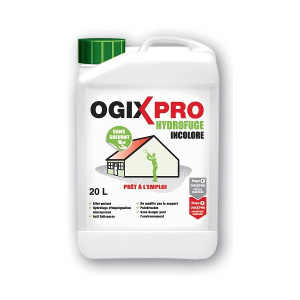 ConseilsAppliquer sur supports propres, sains et secs. Protéger les surfaces qui ne sont pas à traiter. Prêt à l'emploi, ne jamais diluer. Utiliser OGIX PRO Hydrofuge dans un pulvérisateur plastique, qui sera rincé avec de l'eau après usage. Bien homogénéïser OGIX PRO Hydrofuge, puis appliquer sur le support à traiter, du bas vers le haut jusqu'à saturation du support. Appliquer 1 à 2 passes à 10 minutes d'intervalle. Eviter toute surcharge du produit pouvant générer des coulures qui pourraient laisser des traces sur le support. Attendre le séchage complet pour que l'effet hydrofuge soit effectif.