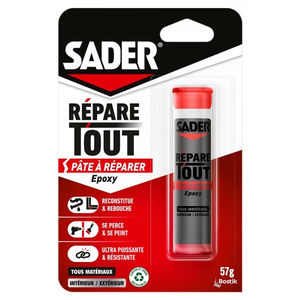 Pâte à réparer multi-usages. Cette pâte à malaxer permet de réparer, reboucher, reconstituer et colmater durablement tous les objets. Sa formule enrichie en titanium lui assure une dureté exceptionnelle. Simple, pratique, rapide (durcit en 4 minutes) et puissante, elle adhère sur tous supports et s'utilise sur tous les matériaux : bois, métal, béton, brique, céramique, plastique... (sauf polyéthylène, polypropylène, et téflon).
