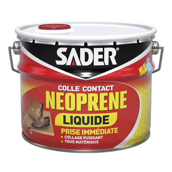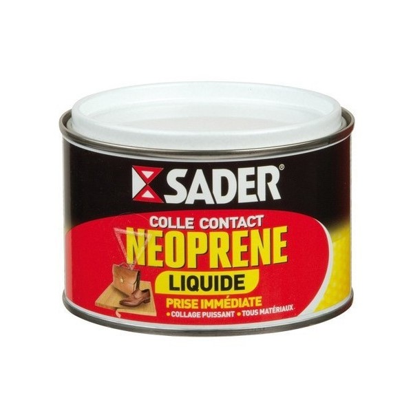 Colle contact néoprène liquide super puissante. Prise immédiate sans serrage. Multi-usages, pour tous matériaux : bois, stratifié, agglomérés, caoutchouc, plastique, cuir, liège, moquette, métaux...