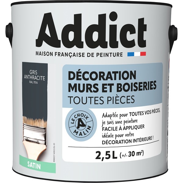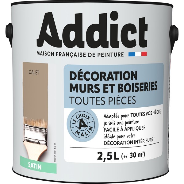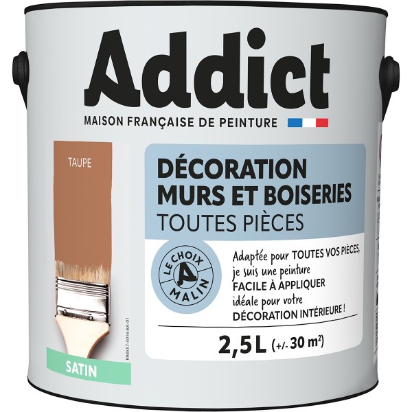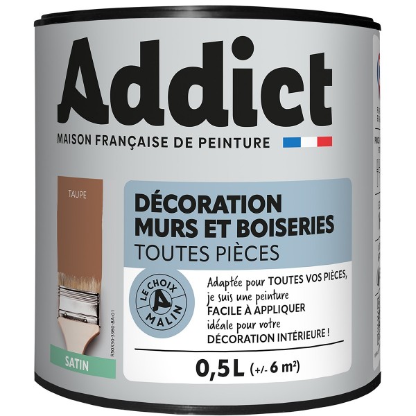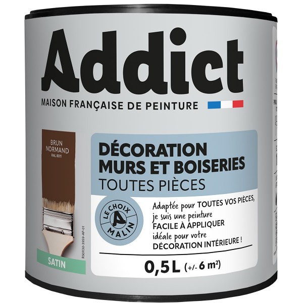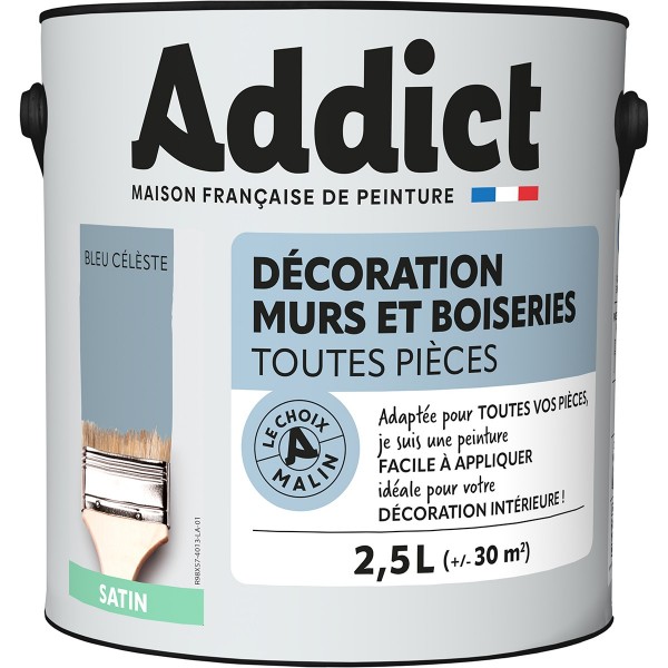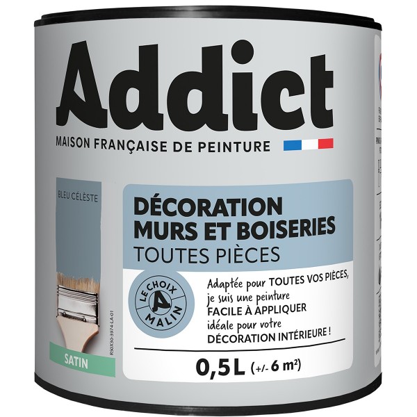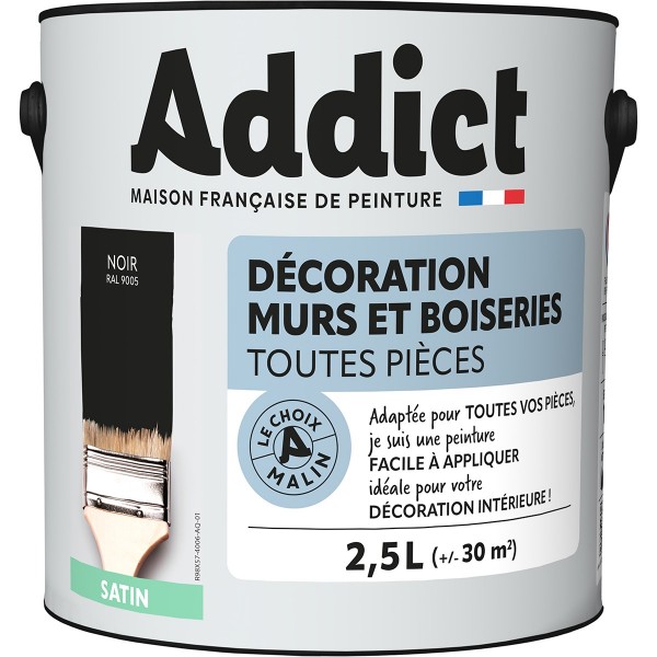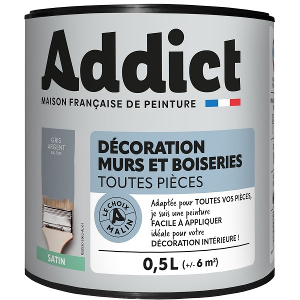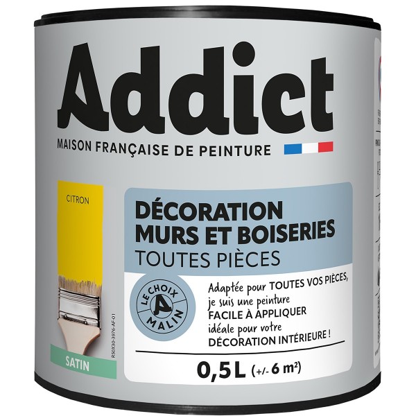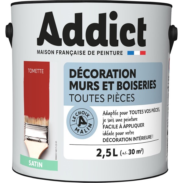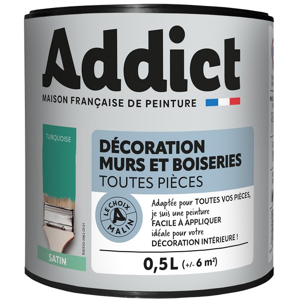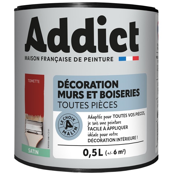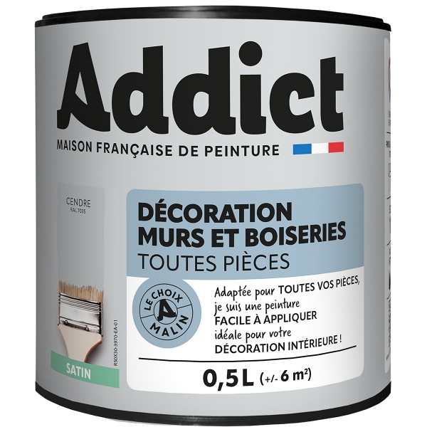 | Conseils | Se conformer au DTU 59. 1. Préparation - Les supports seront propres et sains, les anciennes peintures convenablement lessivées, et les parties métalliques protégées par une couche de primaire anti-rouille. APPLICATION - Bien mélanger avant application. Sur fonds cohérents appliquer 2 couches de ADDICT Peinture Acrylique Satinée. Ne pas appliquer par température inférieure à 5°C ou supérieure à 30°C. |