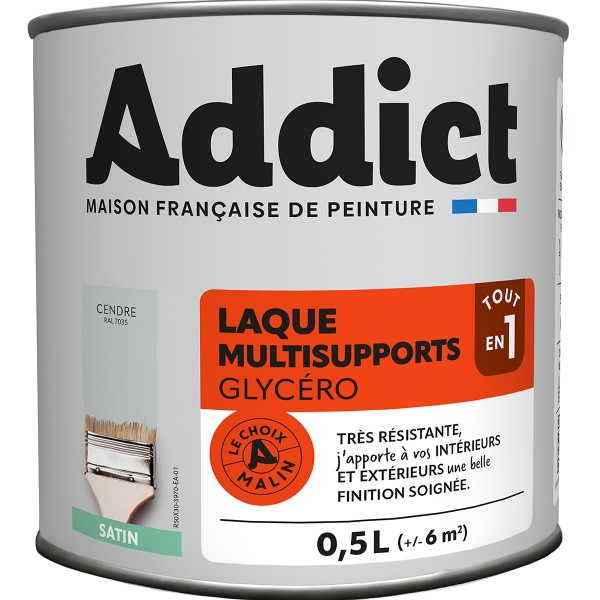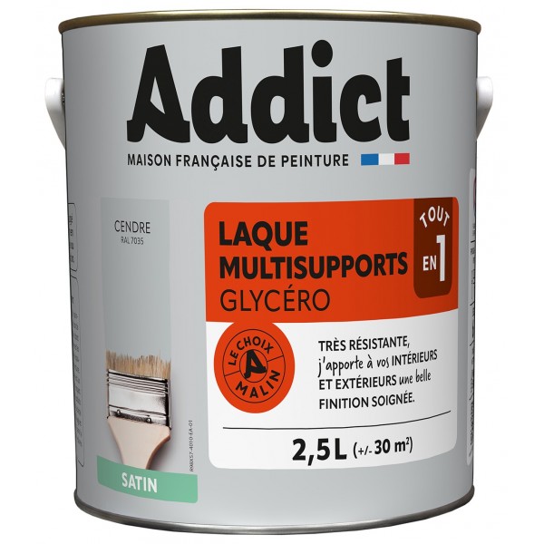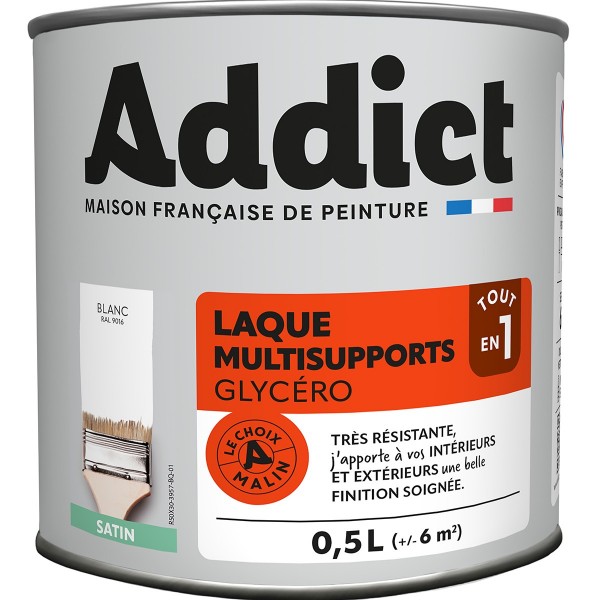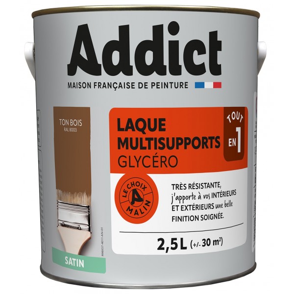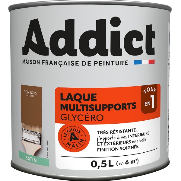 | Conseils | Se conformer au DTU 59. 1. Préparation - Les supports seront propres et sains, les anciennes peintures convenablement lessivées, et les parties métalliques protégées par une couche de primaire anti-rouille. APPLICATION - Bien mélanger avant application. Sur fonds cohérents préalablement imprimés, appliquer 2 couches de ADDICT Laque Glycéro Satinée sans dilution. Ne pas appliquer par température inférieure à 5°C ou supérieure à 30°C. |