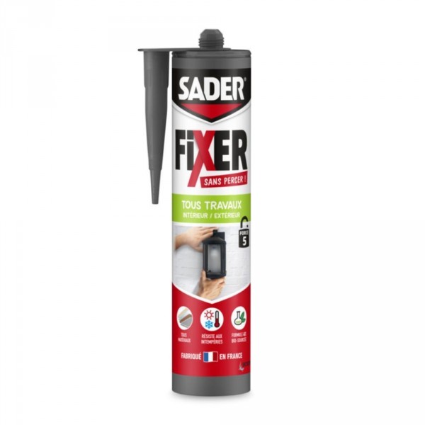 Colle de fixation Sader Fixer Sans Percer Tous Travaux pour tout fixer facilement et durablement. La colle de fixation Sader Fixer Sans Percer Tous Travaux, intérieur/ extérieur est idéale pour tous fixer facilement et durablement. Sa formule transparente permet un collage de patères, étagères, appliques, cadres, miroirs, crédences, prises électriques sur tous les matériaux. ATTENTION : Ne convient pas pour le polyéthylène (PE), le polypropylène (PP) et le téflon (PTFE).