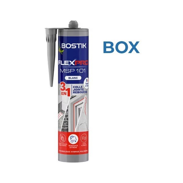 Bostik Flexpro MSP 101 est un mastic colle multi-usages 3 en 1. Il est idéal pour tous les travaux de construction en intérieur comme en extérieur : rebouchage de fissures, joints de dilatation et d'étanchéité autour des huisseries et collages. Résiste à l'eau, aux UV et aux intempéries, résiste aux chocs et vibrations, résiste aux fortes variations de température (de -40°C à +90°C), utilisation intérieure et extérieure, sans retrait ni bullage, élasticité importante et durable, peut être peint après séchage complet.