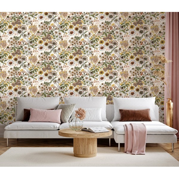 Une profusion de petites fleurs, de tiges fines et de feuillages délicats compose ici un décor foisonnant et plein de charme. Comme un jardin champêtre observé en pleine floraison, ce motif mêle avec finesse les détails botaniques et les touches colorées dans une composition riche mais légère.Les nuances chaudes de jaune, de rouille, de rose poudré et de vert doux apportent vie et spontanéité à l’ensemble. Ce papier peint transforme le mur en tableau floral, avec un esprit à la fois romantique, naturel et joyeux.Ce papier peint intissé est idéal pour insuffler à votre intérieur une note fleurie et raffinée, tout en bénéficiant d’une pose simple et confortable.
