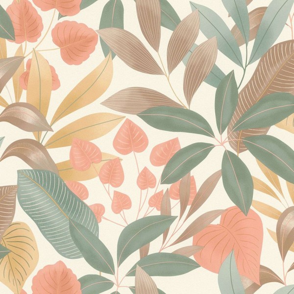 De larges feuillages stylisés se déploient dans une composition généreuse et lumineuse, où chaque forme semble danser avec légèreté. Les feuilles aux lignes délicates et aux contours souples créent un décor végétal très graphique, à la fois moderne et apaisant.La palette mêle avec harmonie des verts adoucis, des roses poudrés, des beiges chauds et des touches dorées, pour une ambiance douce, élégante et ensoleillée. Ce motif habille le mur avec personnalité tout en conservant beaucoup de fraîcheur.Ce papier peint intissé est parfait pour créer un univers décoratif chaleureux et raffiné, inspiré par une nature stylisée pleine de douceur.