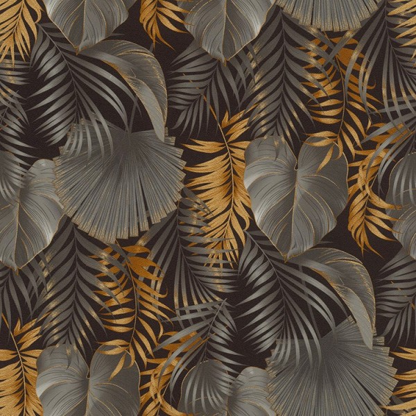 Un foisonnement de feuillages aux formes variées compose ce décor végétal très expressif. Les grandes feuilles arrondies, les palmes et les motifs graphiques s’entrelacent dans une composition dense et dynamique, inspirée d’une nature luxuriante.Le contraste entre le fond sombre et les teintes chaudes d’ocre, de brun et de gris crée une ambiance élégante et profonde. Ce papier peint apporte du caractère à la pièce et devient un véritable élément décoratif, idéal pour un mur d’accent.Ce papier peint intissé associe intensité visuelle et facilité de pose pour transformer l’espace avec style.
