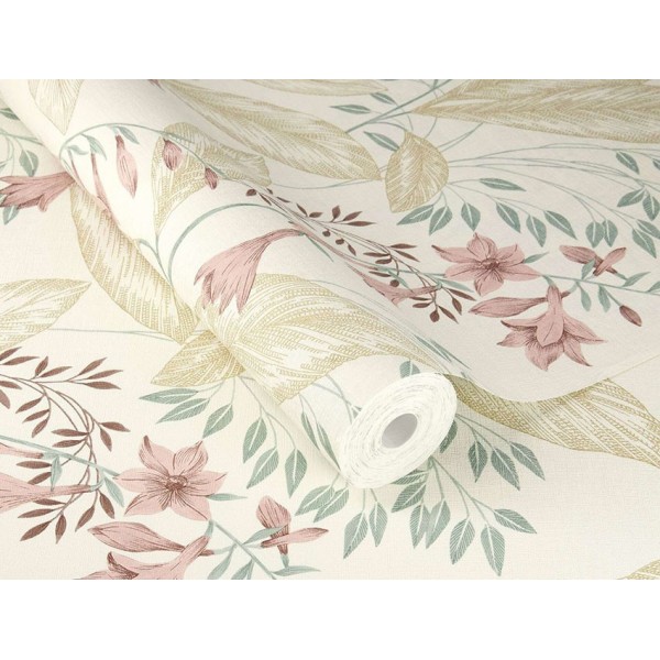 Un délicat entrelacement de feuillages et de fleurs légères prend vie dans une composition douce et raffinée. Les tiges fines s’élèvent avec grâce, ponctuées de petites corolles aux teintes rosées et de feuilles aux nuances naturelles, créant un motif à la fois fluide et structuré. L’ensemble évoque une scène végétale stylisée, où chaque détail semble dessiné avec précision et délicatesse. Les couleurs tendres, entre vert sauge et rose poudré, diffusent une ambiance chaleureuse et apaisante, idéale pour un intérieur élégant et accueillant. Ce papier peint intissé offre un équilibre parfait entre charme décoratif et simplicité de mise en œuvre.