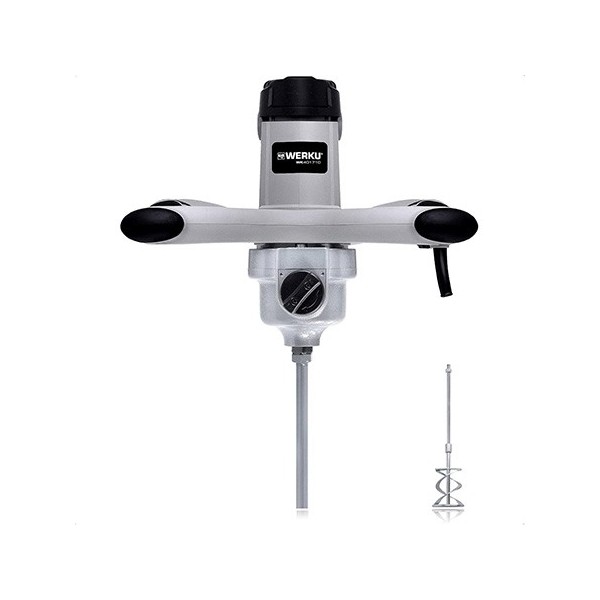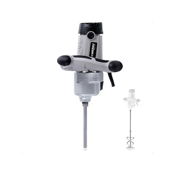 Werku WK401710-Mélangeur Peinture-Mortier. Qualité Professionnelle comprend 1 tige mélangeur. Puissance de 1800W, tours de 180-400 et 300-700 par minute,12 vitesses, couple maximal de 70Nm et capacité de mélange de 100kg. Corps en ABS composite et aluminium anodisé, manche ergonomique et antidérapant, sélecteur de vitesse et sélecteur de 2 gammes de vitesses. Comprend tige mélangeuse de 140 mm et manuel d'instructions. Excellente norme de qualité, durabilité, résistance.