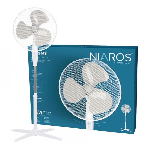 Ventilateur de bureau GARSACO. 340x350mm. 45W. 230V. 50Hz. 3 vitesses. Entre 1000 et 1250 RPM. Tête oscillante. Angle d'inclinaison réglable. Grille de protection. 2 positions : fixe ou rotative.