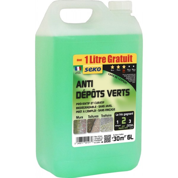 | Conseils | Détruit tous les dépôts verts, lichens, bactéries, moisissures/champignons. Matière active - 24g/kg de Chlorure de N, N diméthyl Alkyl benzylammonium. Produit sans chlore - sans javel. Biodégradable à sup90% S'applique au pulvérisateur ou à l'arrosoir. |