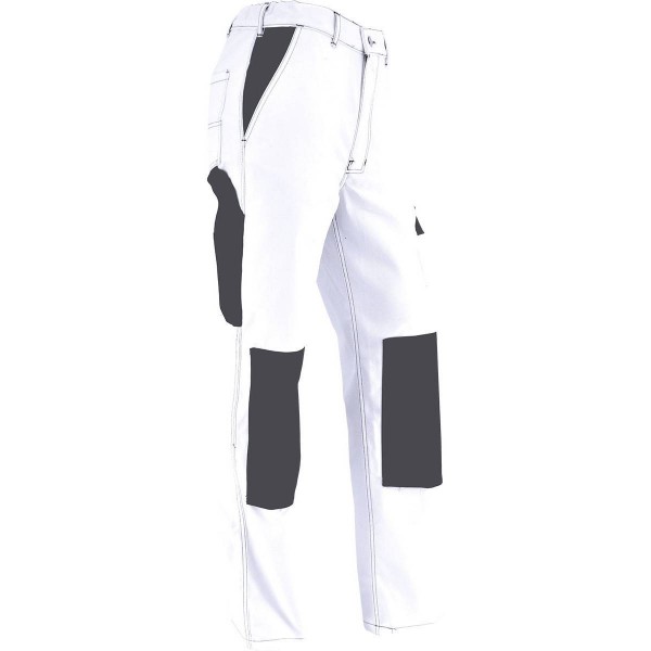 Pantalon blanc/gris en coton renforcé de polyester (65% coton 35% polyester). Taille avec élastique. Devant, deux poches en biais. Derrière, deux poches plaquées. Jambe gauche, une poche plaquée avec rabat. Jambe droite, deux poches mètre superposées. Braguette à glissière, emplacements pour les genouillères. Confortable et pratique. Livré avec une paire de genouillères norme CE EN 14404 + A1 Conforme à la norme EN ISO 13688 : 2013 (EPI de catégorie II conforme à la directive 89/686 jusqu'en Avril 2018, puis conforme au règlement 2016/425 à partir d'Avril 2018)